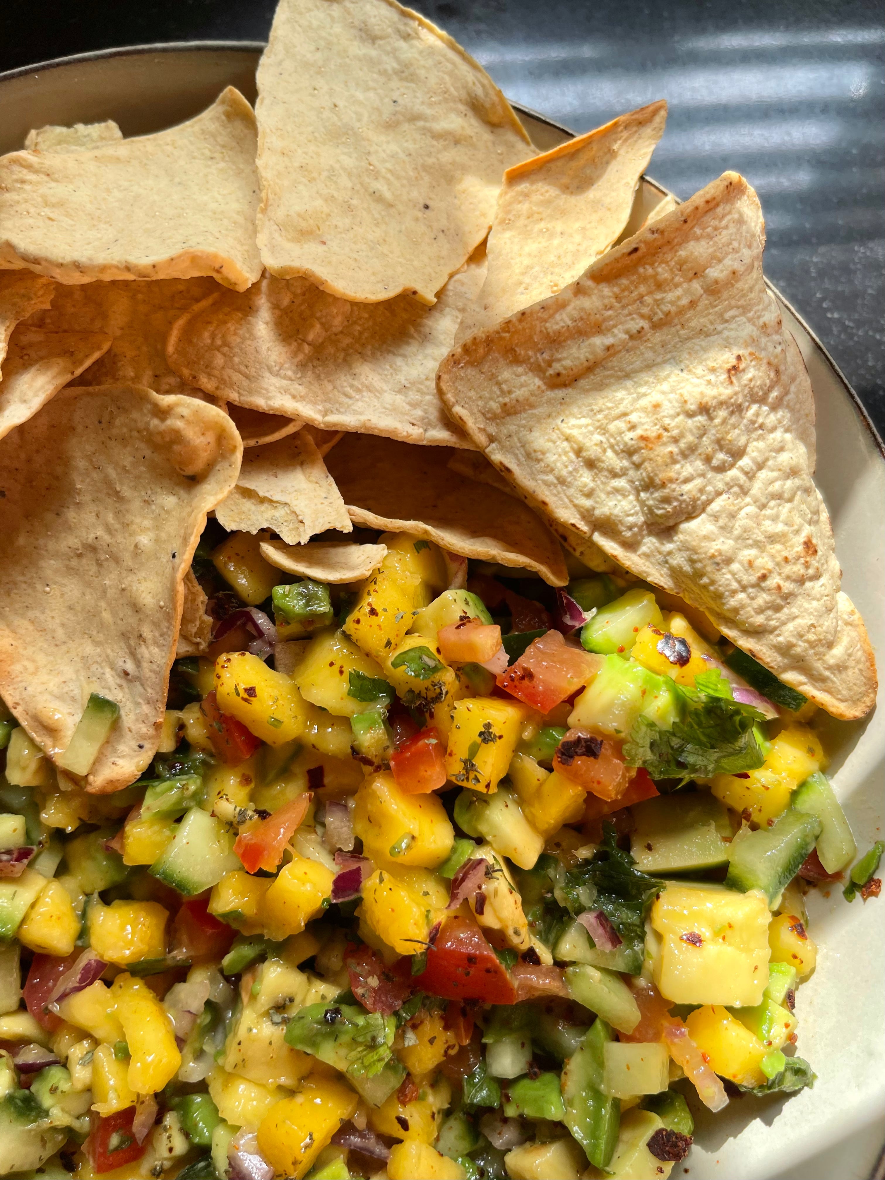 Deze salsa is voedzaam, kleurrijk en erg lekker. Ideaal als bijgerecht op een BBQ of als tussendoortje mee naar een picknick. Door de limoensap blijft het lang goed en wordt het fruit niet bruin. Erg geschikt om vooruit te maken en dus altijd een gezond tussendoortje bij de hand te hebben.