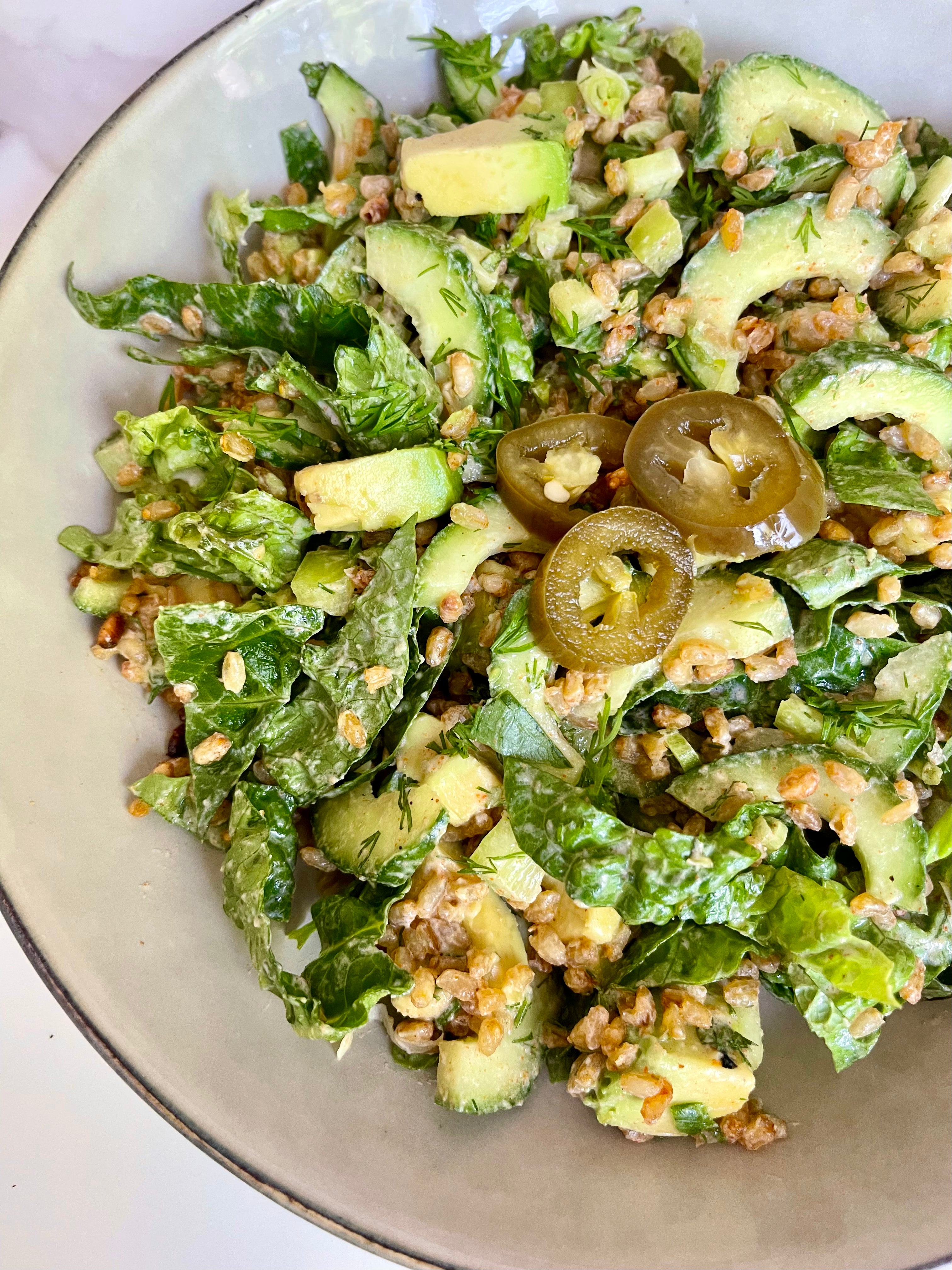 De dressing maakt ik van het sap van 1 ctiroen, scheut olijfolie, eetlepel Griekse yogurt, de kruiden en een beetje water.