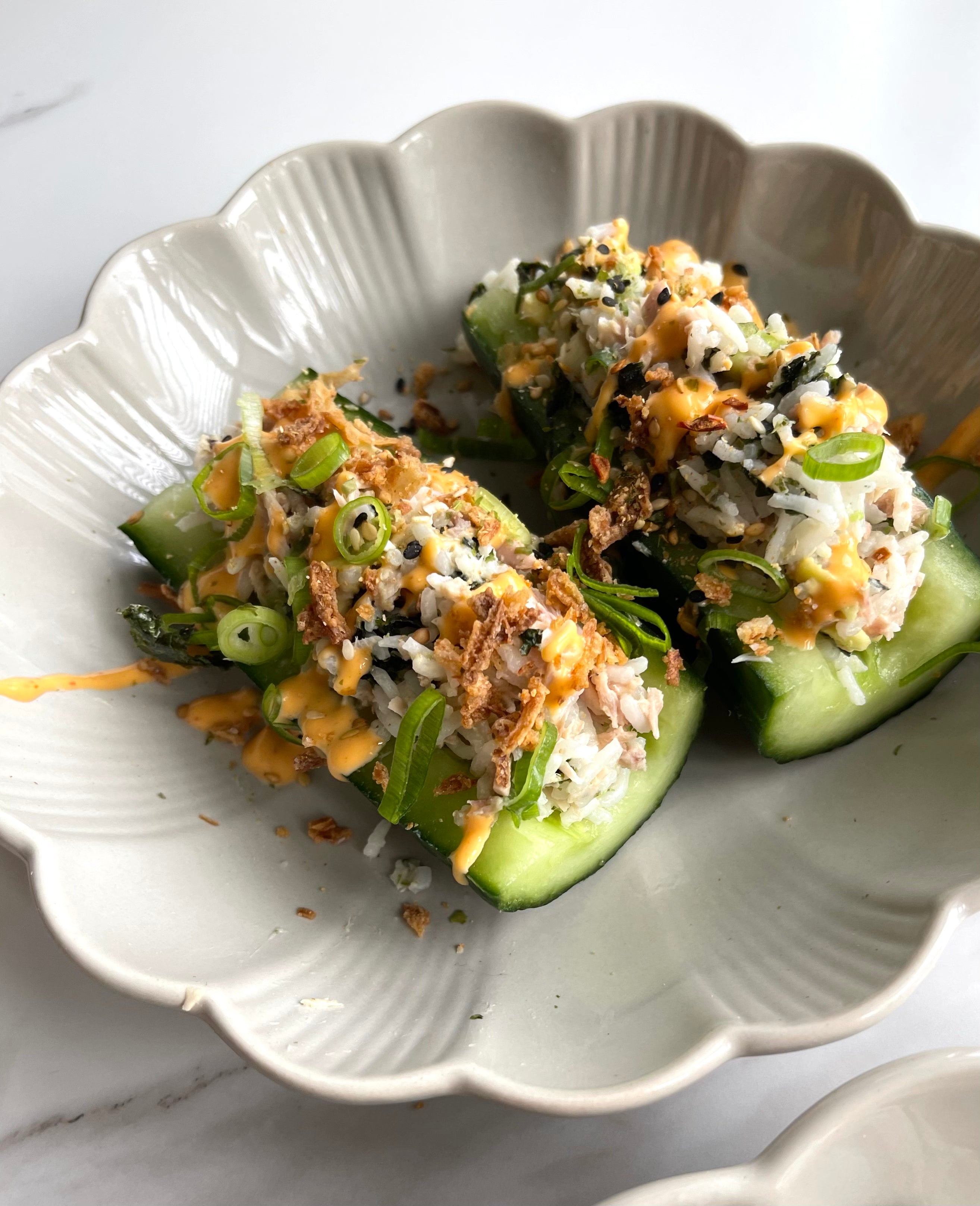 De komkommer snijd je over dwars en in de lengte in de gewenste grootte. Daarna lepel je de binnenkant eruit. Vul de komkommerstukjes met de salade en top het af met bijvoorbeeld sriracha, gedroogde uitjes of nog meer lente-ui.