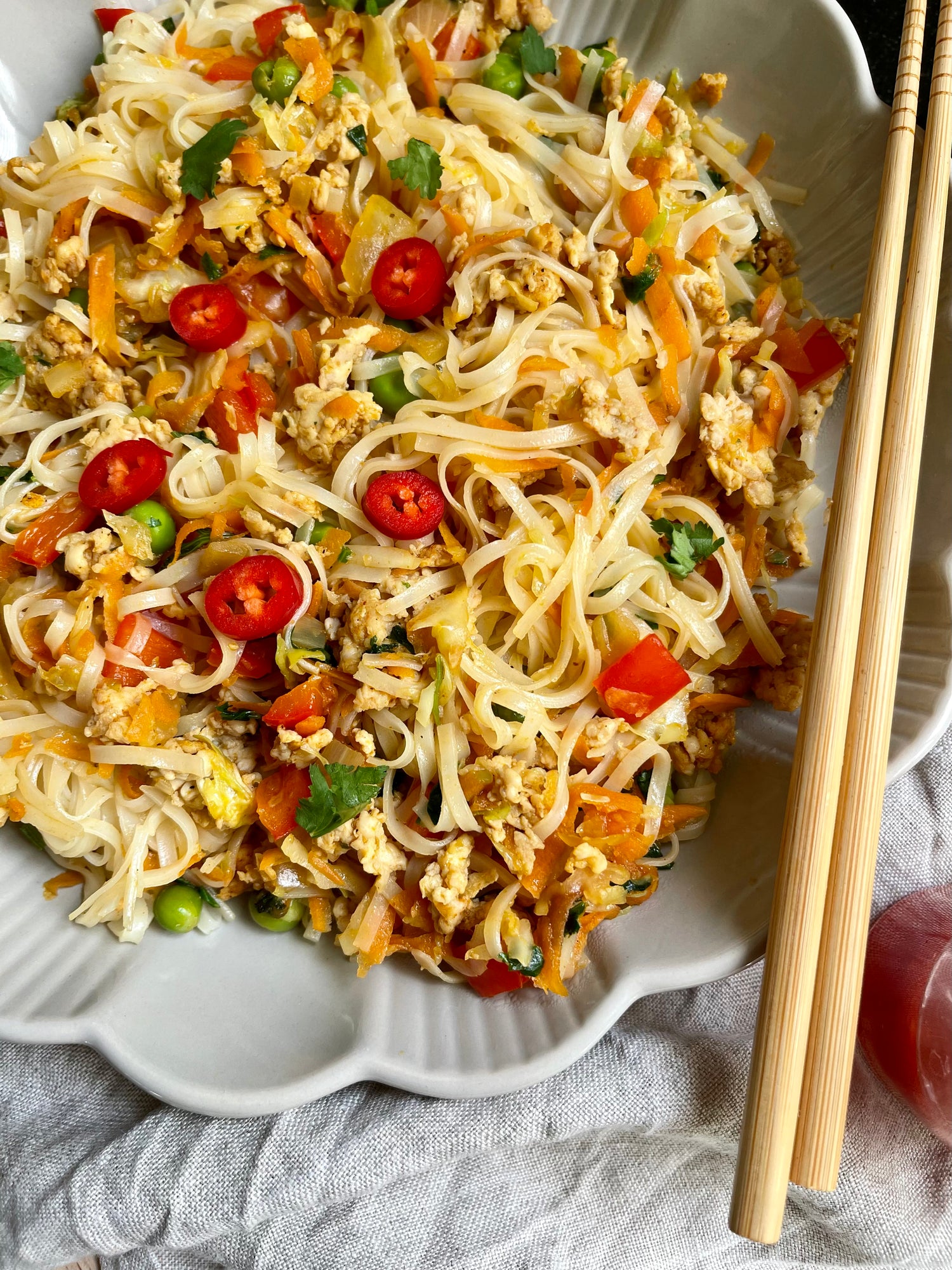 Ik maakte deze heerlijke garnalen salade met knapperige groenten en rijstnoodles. Zowel koud als lauwwarm errrug lekker.