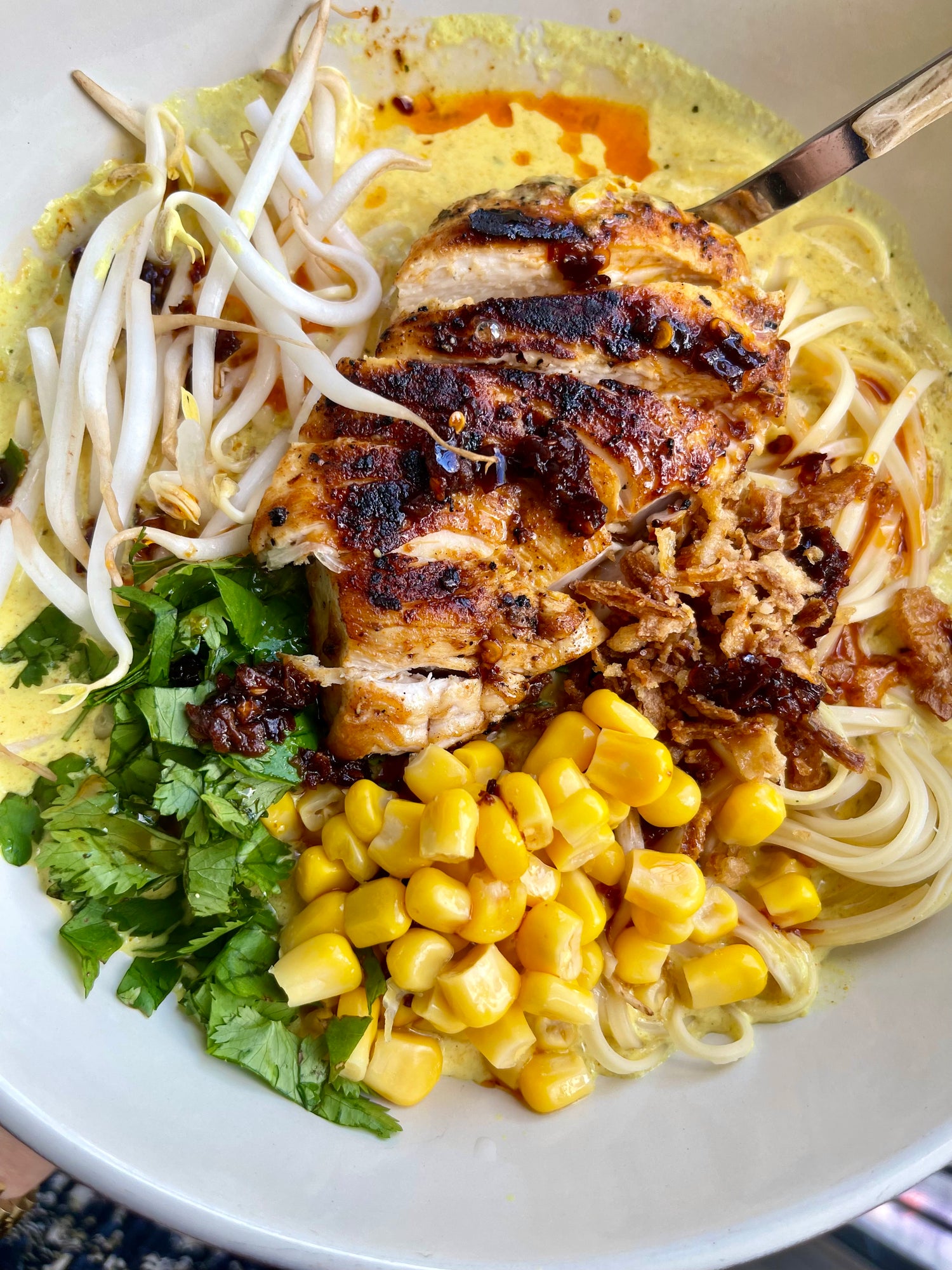 Romige kokos/limoensoep met gegrilde kip en noodles